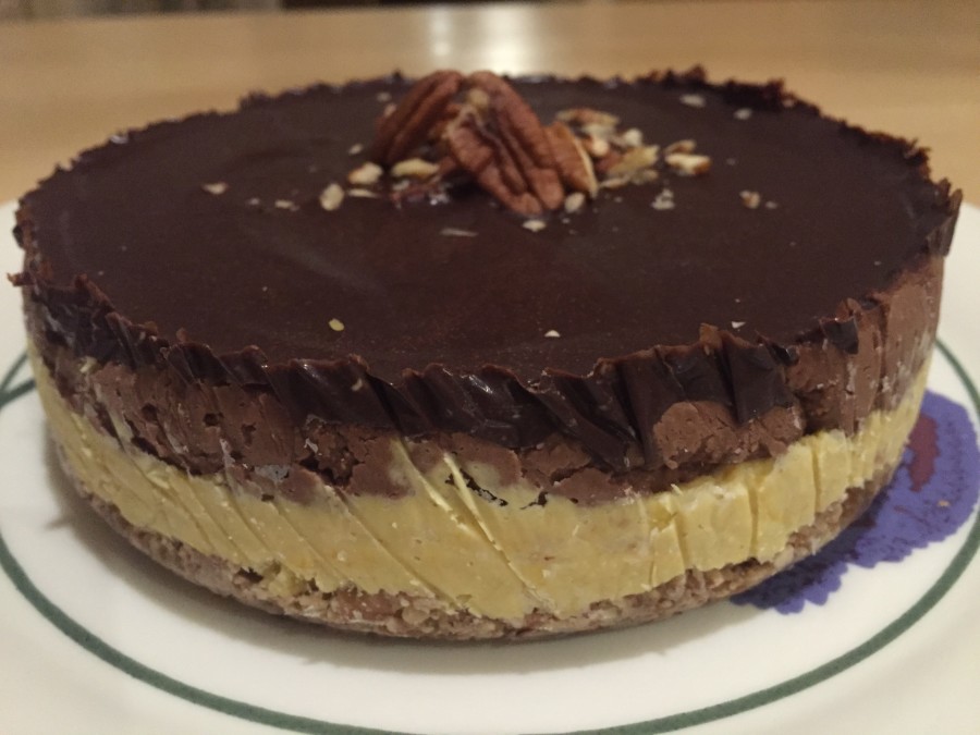 SEKOITA kaikki raaka-aineet blenderissä kunnes massa on täysin tasaista. Kaada kakkupohjan päälle ja kopauta vuokaa pöytään jotta ilmakuplat poistuvat. Tämän jälkeen tee suklaatäyte.
