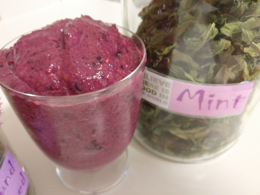 Sekoita ainesosat blenderissä sekaisin. Laita sekaan ripaus kuivattua minttua.