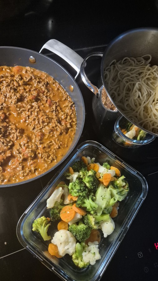 Paista jauheliha, lisää paseerattu tomaatti, mausteet ja 2krl ruokakermaa. Kiehauta.