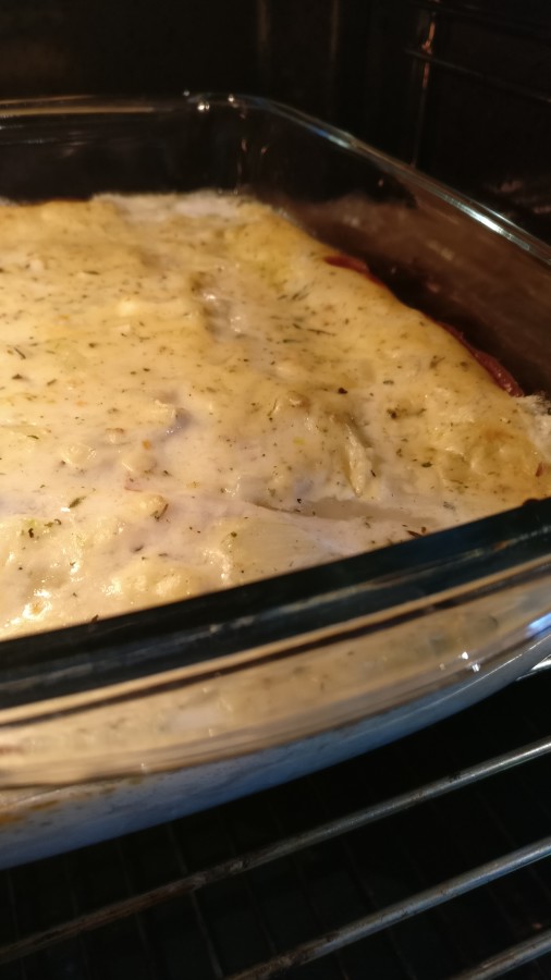 Vauhdittaaksesi kypsennystä voit sulattaa seitipaloja mikrossa 3 min jonka jälkeen kaada vesi pois. Kuutioi sipuli ja valkosipuli. Levitä kalat uunivuokaan, ripottele pinnalle sipulit ja mausteet. Lisää kaurakerma ja kypsennä.uunissa 1 tunti 200 asteessa.