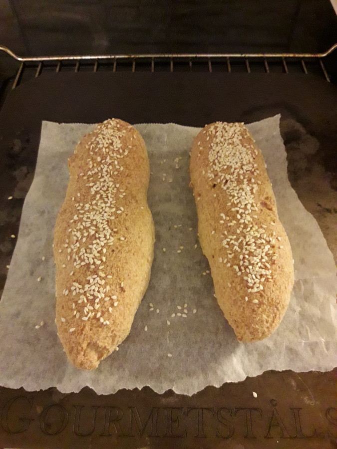 Mittaa kuivat aineet keskenään. Kiehauta vesi ja lisää se joukkoon. Sekoita. Erottele valkuaiset, lisää ne ja etikka. Sekoita. Vatkaa muutama minuutti jos haluat kuohkeampia, myös käsin vatkaaminen riittää. Taikinan kuuluu olla liisterimäistä, muovailuvahan tyylistä. Muotoile 2 patonkia. Paista riittävän kauan tunnin verran kunnes ovat saaneet väriä. Anna jäähtyä. Halkaise ja täytä. 1 patonki painaa n. 150 g paistettuna. Erittäin hyvää..