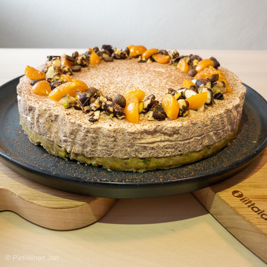 Murskaa pistaasit ja saksanpähkinät lihanuijalla tai kaulimella vahvassa muovipussissa rouheeksi. Voit myös käyttää blenderiä mutta älä jauha pähkinöitä liian hienoksi. Sulata voi mikrossa. Sekoita pähkinärouhe, mantelijauhe ja stevia sulaneeseen voihin. Laita irtopohjavuoan pohjaan leivinpaperi. Painele massa pohjalle. Tee mousse: laita liivatelehdistä likoomaan kylmään veteen. Keitä vahvaa kahvia. Vispaa kerma sähkövatkaimella vaahdoksi. Lisää kermavaahdon joukkoon tuorejuusto ja sulatettu suklaa. Sekoita nopeasti sekaisin sähkövatkaimella. Sekoita lionneet liivatelehdet kuumaan kahviin. Sekoita sitten kahvi muuhun massaan ja kaada koko seos irtopohjavuokaan pohjan päälle. Tasoita pinta lusikalla ja laita jääkaappiin hyytymään muutamaksi tunniksi. Kun kakku on hyytynyt, irroita kakku vuoasta ja koristele se esim. Suklaamanteleilla, pähkinöillä ja marjoilla.