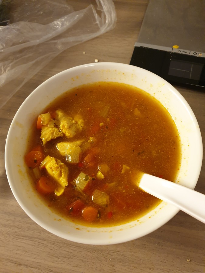 Kypsä saarioisten kana. Tai muu hunajamarinoitu kana kypsennettynä ensin. Muut tuoreita. 1 iso tai 2 normia lautasta. Kaloreitten mukaan tein ittelle yhden. Mut muumikulhollinen vie jäi yli. Grillimauste jota käytin oli tulinen versio. Miedommalla grillimausteella kokeilen seuraavaksi ja tarjoan miedommastakin pitäville ja ilman chiliä. Määrät mausteissa suuntaa antavia. Vesi arvio. Mutta pohja täyteen ja mukava keiton koostumus. Maku mielettömän hyvä. Kuivattua Persiljaa n 1 tl. Muut ripauttelin.