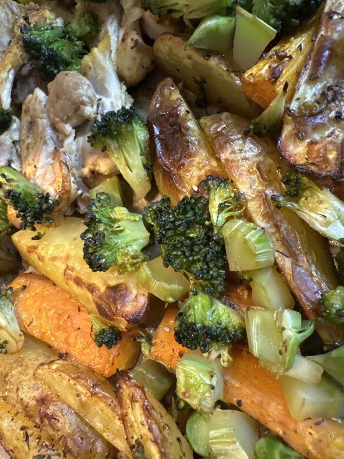 225 uuni lämpenemään. Pilko perunat ja porkkanat. Mausta öljyllä (1 rkl) yrttisekoituksella, mustapippurilla, paprikalla ja suolalla. Mausta paistileikkeet curryllä, suolalla, mustapippurilla, öljyllä (1 rkl). Laita uuniin 25 min. Pilko parsakaali pieneksi (varsineen) ja mausta soijakastikkeella ja öljyllä (0,5 rkl). Lisää sekaan valkosipuli. Lisää parsakaalit ja paista vielä 8-10 min, kunnes kanat kypsät. Tarjoa kastikkeeksi kermaviili, jossa puntti ruohosipulia ja 0,5 rkl dijonsinappia.