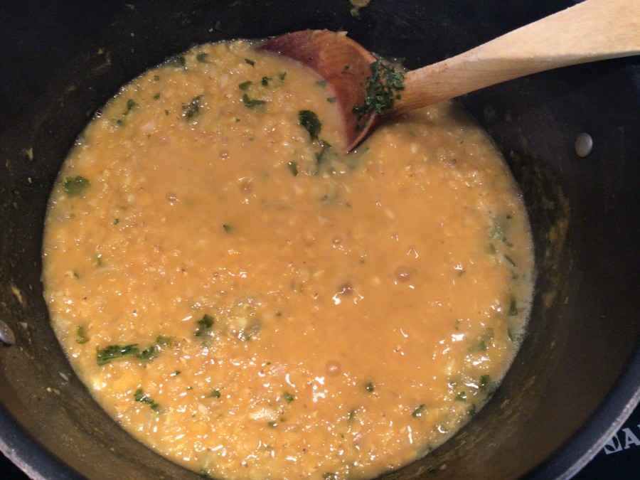 Kuullota sipulit oliiviöljyssä . Lisää liotetut ja valutetut linssit. Lisää litra kasvislientä. Keitä noin 25 min