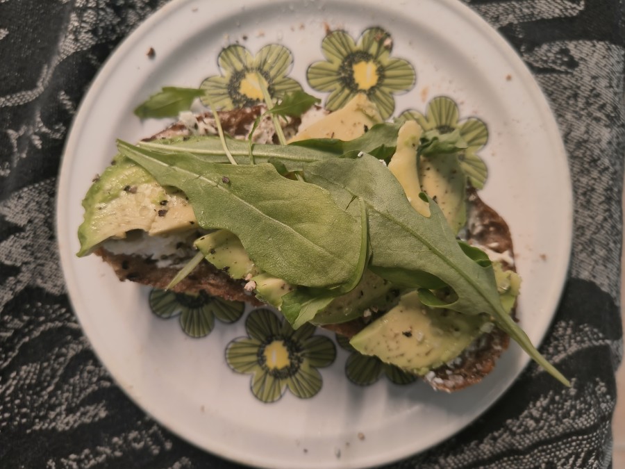 Paahda leipä leivänpaahtimessa tai mieluummin voissa pannulla. Levitä alle jalopenotuorejuusto, feta ja avokadoviipaleet. Päälle suolaa ja pippuria myllystä maun mukaan. Koristele rucolalla.