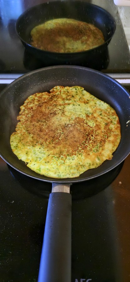 Ainekset taikinaksi ja paistoon. Kuuma pannu, 1,5-2 minuuttia per puoli.