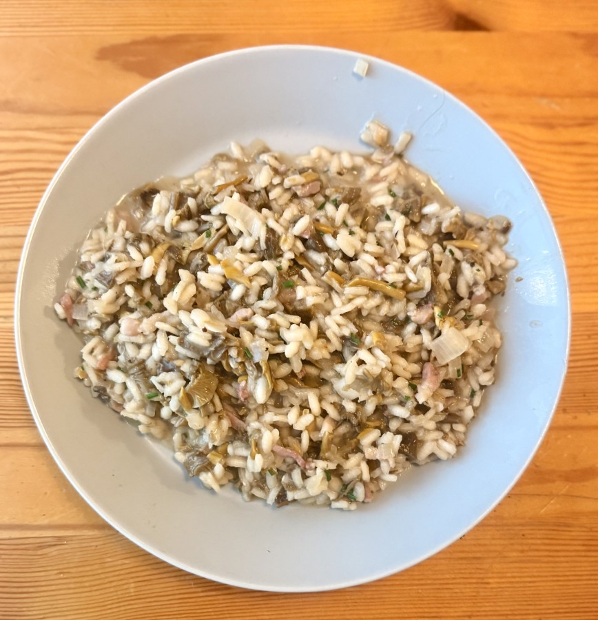 Lisää sienet ja pekoni riisin joukkoon ja lisää kiehuvaa lientä niin, että riisit peittyvät. Lisää lientä vähitellen aina kun neste on haihtunut. Kypsennä risottoa n. 15-20 min, kunnes riisi on al dente ja koostumus puuroutunut.