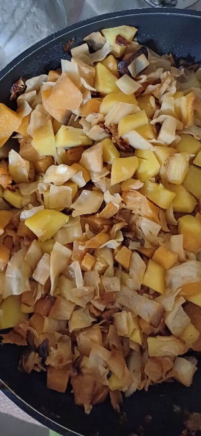 Pilko lanttu, kaali, peruna ja sipuli. Öly pannuun ja paista ensin lanttukuutioita, lisää seuraavaksi kaali ja viimeksi perunat ja sipuli. Lisää veteen sulatettu kasvisliemikuutio. Hauduta ja kypsytä kannen alla, kunnes ovat kypsiä.