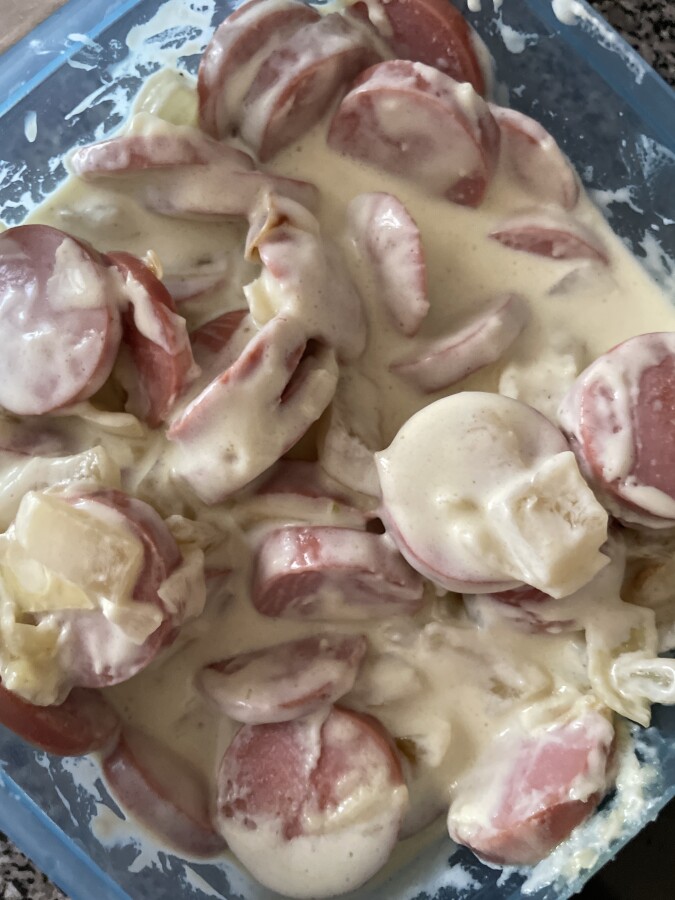 Paista sipuli ja makkara ja lisää kerma
