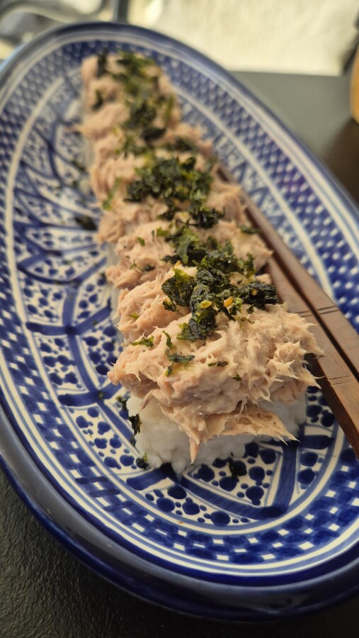 Sekoita tonnikalatahna, lisää Kiko sushi päälle wasabia ja tahna. Ripottele päälle merilevää. Dippaa soijaan ja nauti.