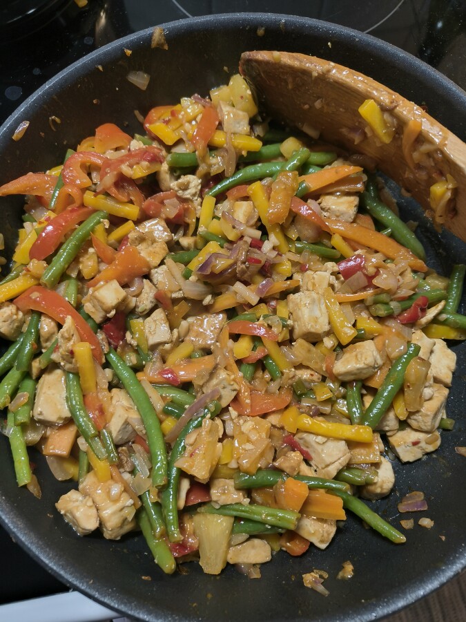 Kypsennä tofu, lopussa kiehauta paketin marinadi pannulla. Ota sivuun. Kypsennä kasvikset ja puolet tölkkiananaksista. Heitä tofut sekaan ja lopuksi neste (ananastölkin liemi, soijakastike ja Maizena), joka vaan kiehautetaan.