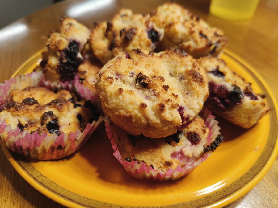 Sulata voi mikrossa, sekoita siihen makeutusaine. Lisää kananmunat ja rahka. Lisää kuivat aineet. Sekoita, lisää varovasti jäiset marjat. Lusikoi muffinssivuokiin ja paista 175 asteessa noin 20min.